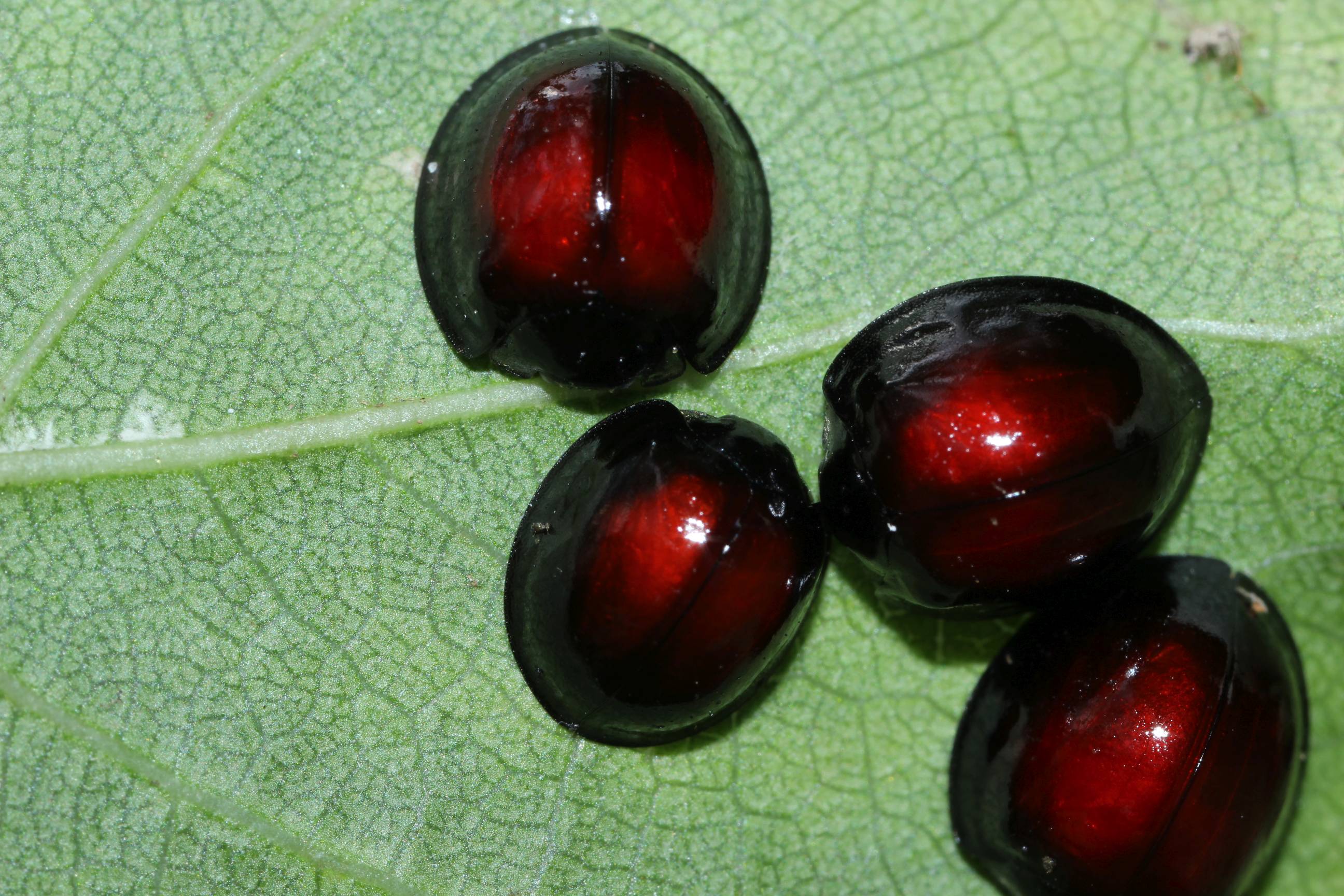 鞘翅の中央部分が星というよりもぼんやりと透き通った赤い色をしています。ヒメアカホシテントウと比較すると大きく、写真中央の小さめな個体の体長は約6.0mm、その右側のやや大き目な個体は約6.7mm。