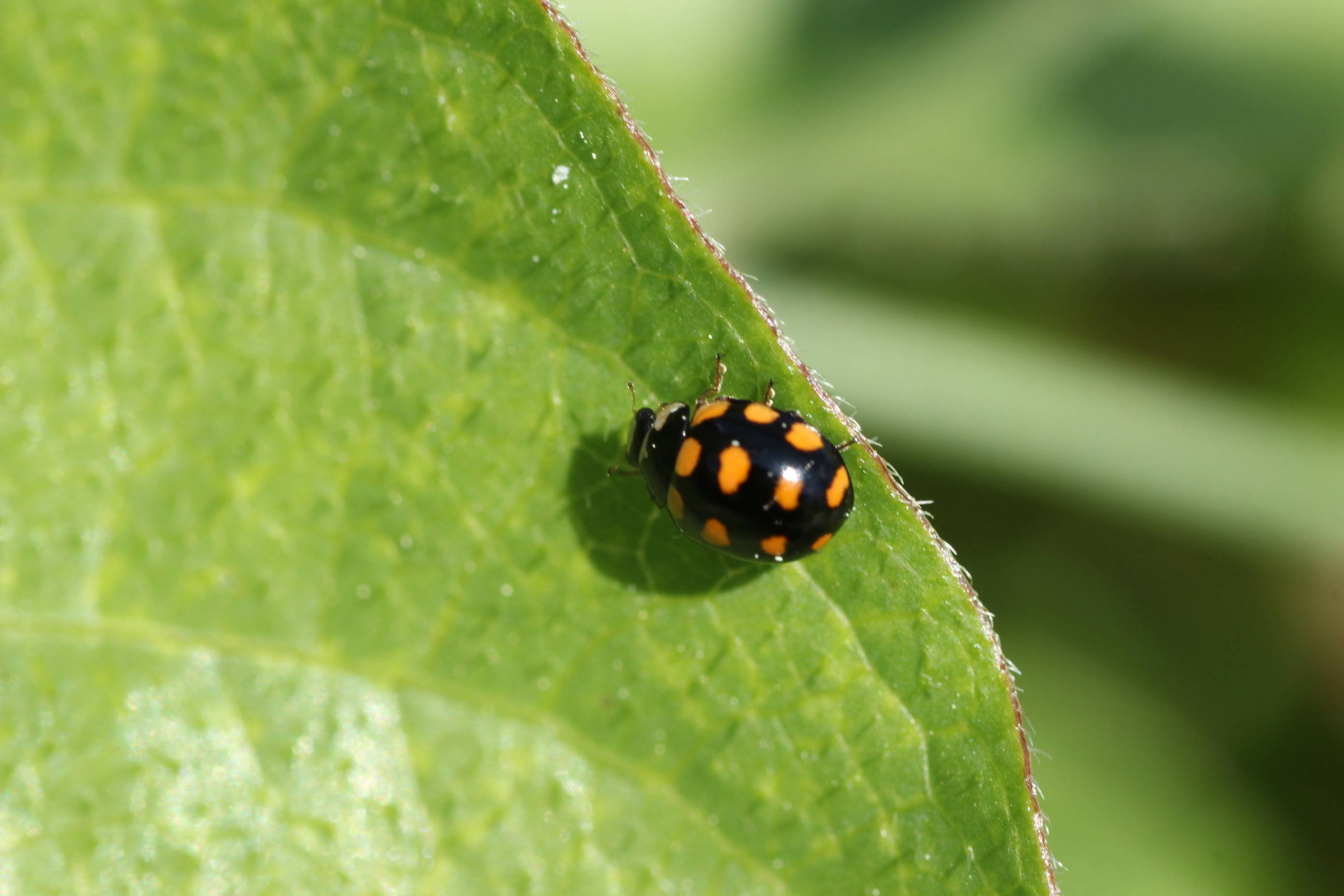 黒地にオレンジ色の斑紋が14個あるテントウムシです。