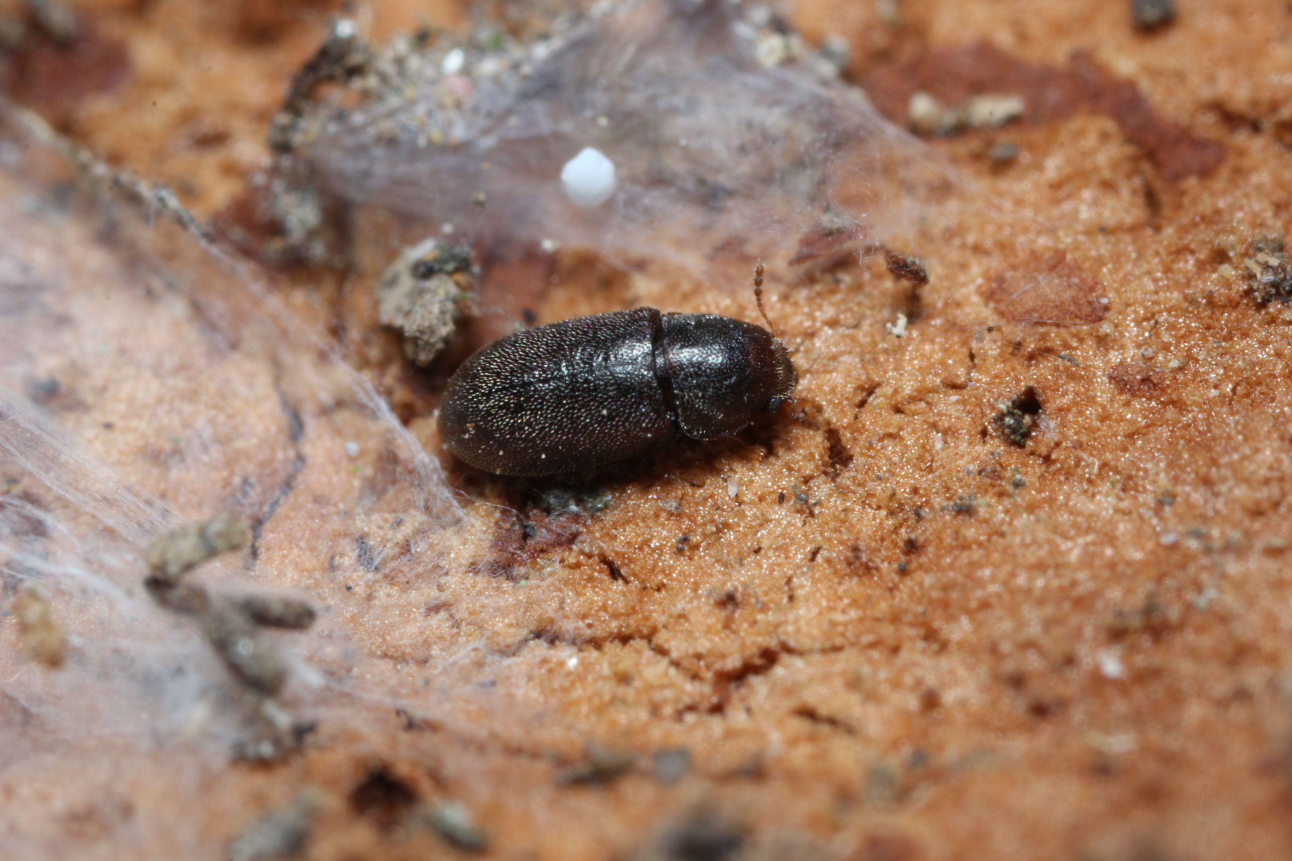 保育社の原色甲虫図鑑ではスエヒロタケツツキノコムシという名前で掲載されています。写真の個体の体長は約2.1mm。