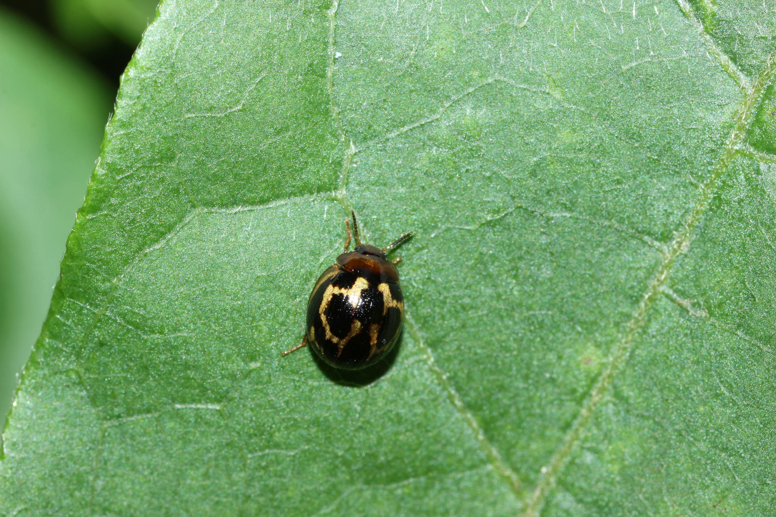 保育社の原色日本甲虫図鑑はニセクロホシテントウゴミムシダマシとクロホシテントウゴミムシダマシの図版が入れ替わっていて、正しくは前胸背板の基方中央部が黒褐色になっているのがニセクロホシテントウゴミムシダマシだそうです。