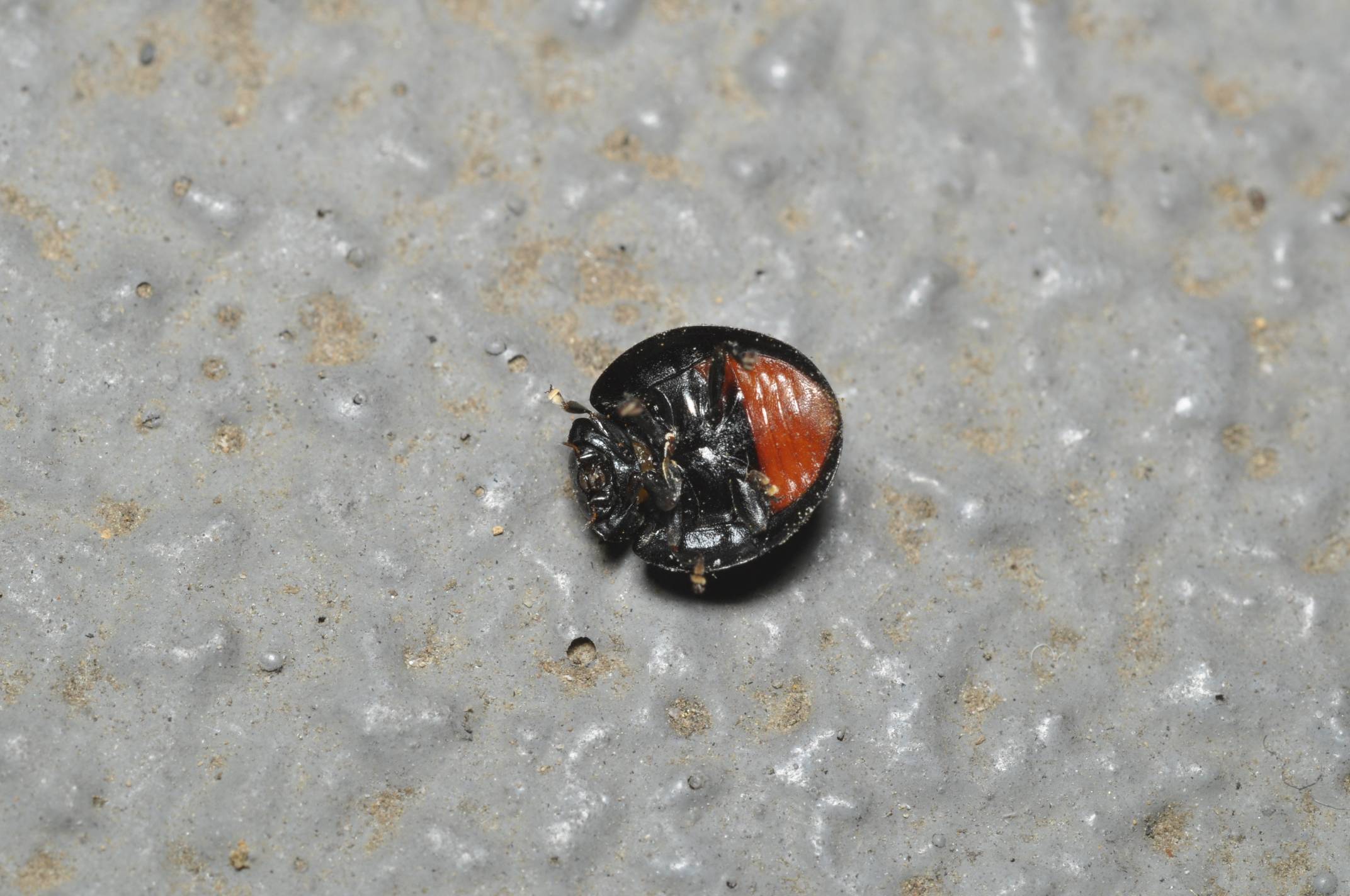 ヒメアカホシテントウの腹面は、胸部は黒ですが腹部は赤褐色をしています。