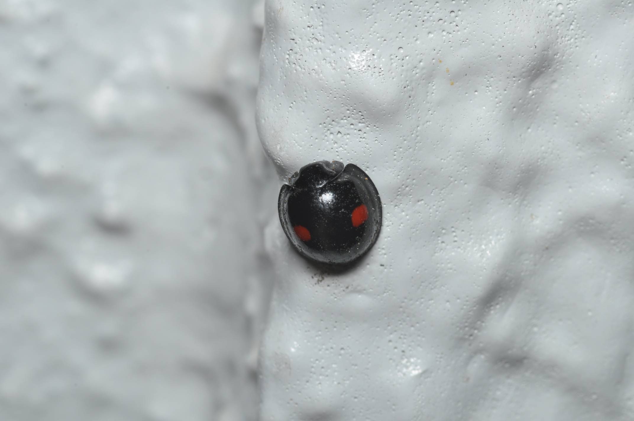 比較的よく目にする種類です。鞘翅のほぼ中央に赤い小さな丸い斑紋が一対あります。写真の個体の体長は約4.0mm。