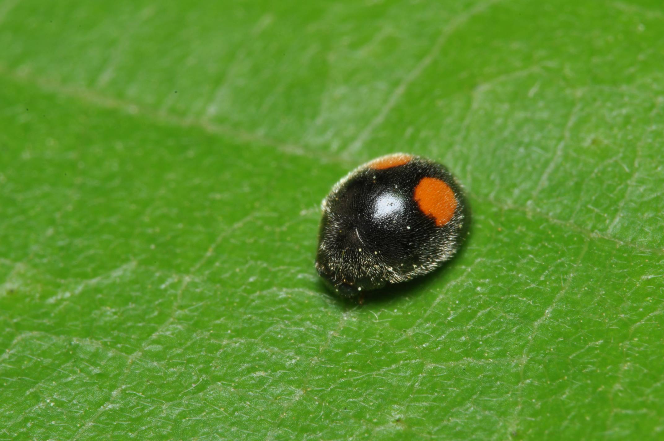 鞘翅の中央よりやや後方によく目立つ一対の丸いオレンジ色の斑紋があり、背面は全体的に短い毛で覆われています。