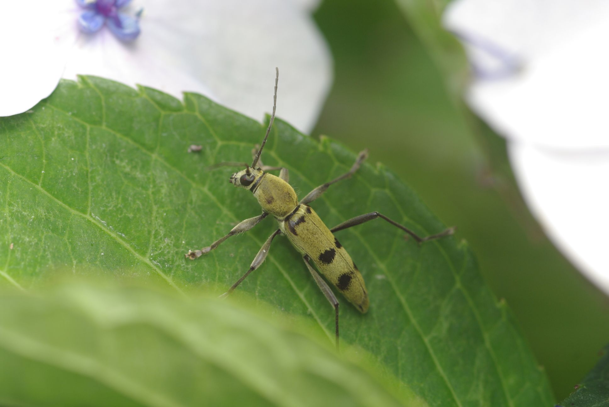 近所の公園のガクアジサイでフタオビミドリトラカミキリが見られるという情報をもらって見に行きました。前日は全くみられませんでしたが、この日はあっけなく見つけることができました。
