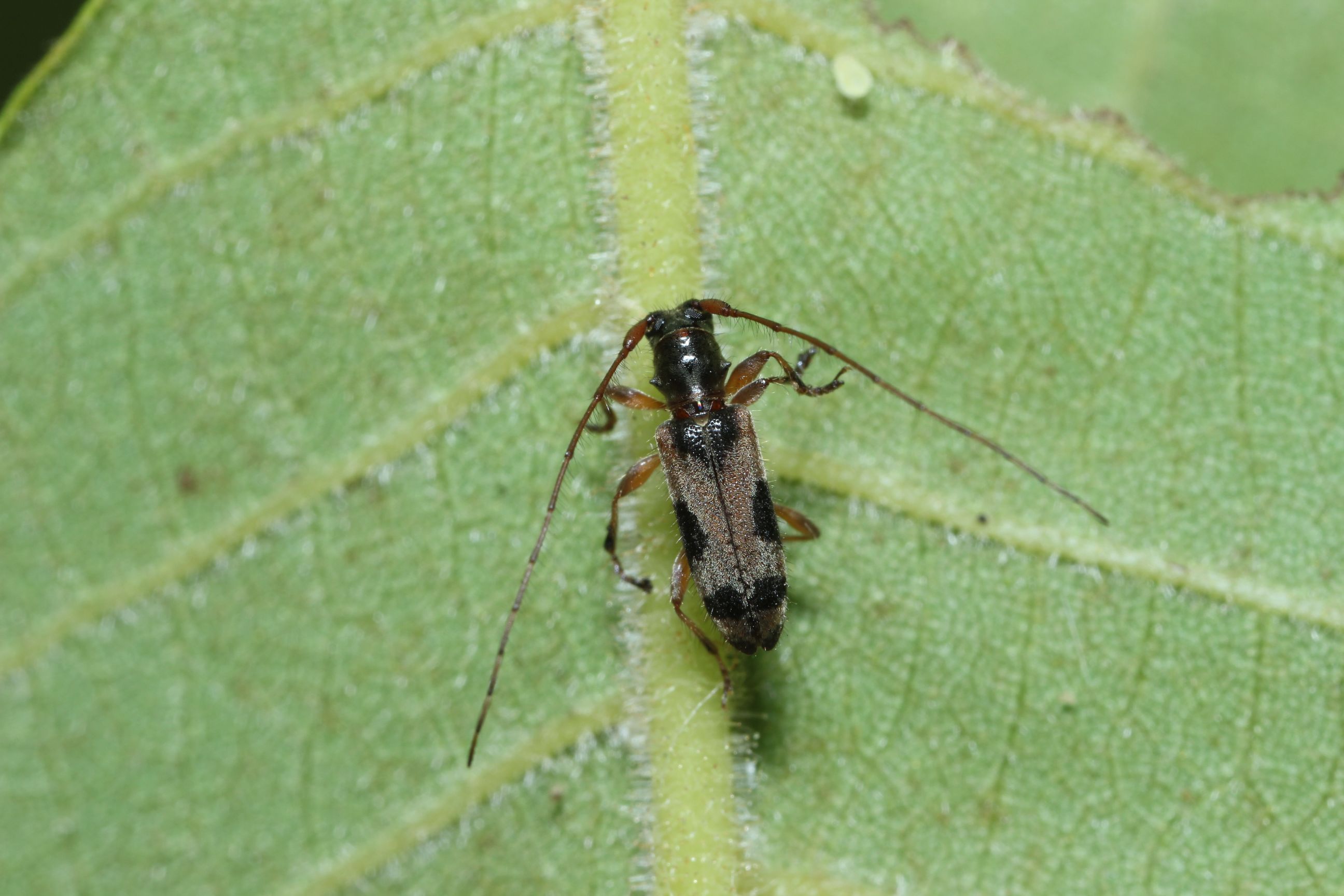 この場所は、初見の昆虫を何回か見つけている験の良いスポットですが、今回はフタモンアラゲカミキリを初めて見つけました。写真の個体の体長は約5.9mm。