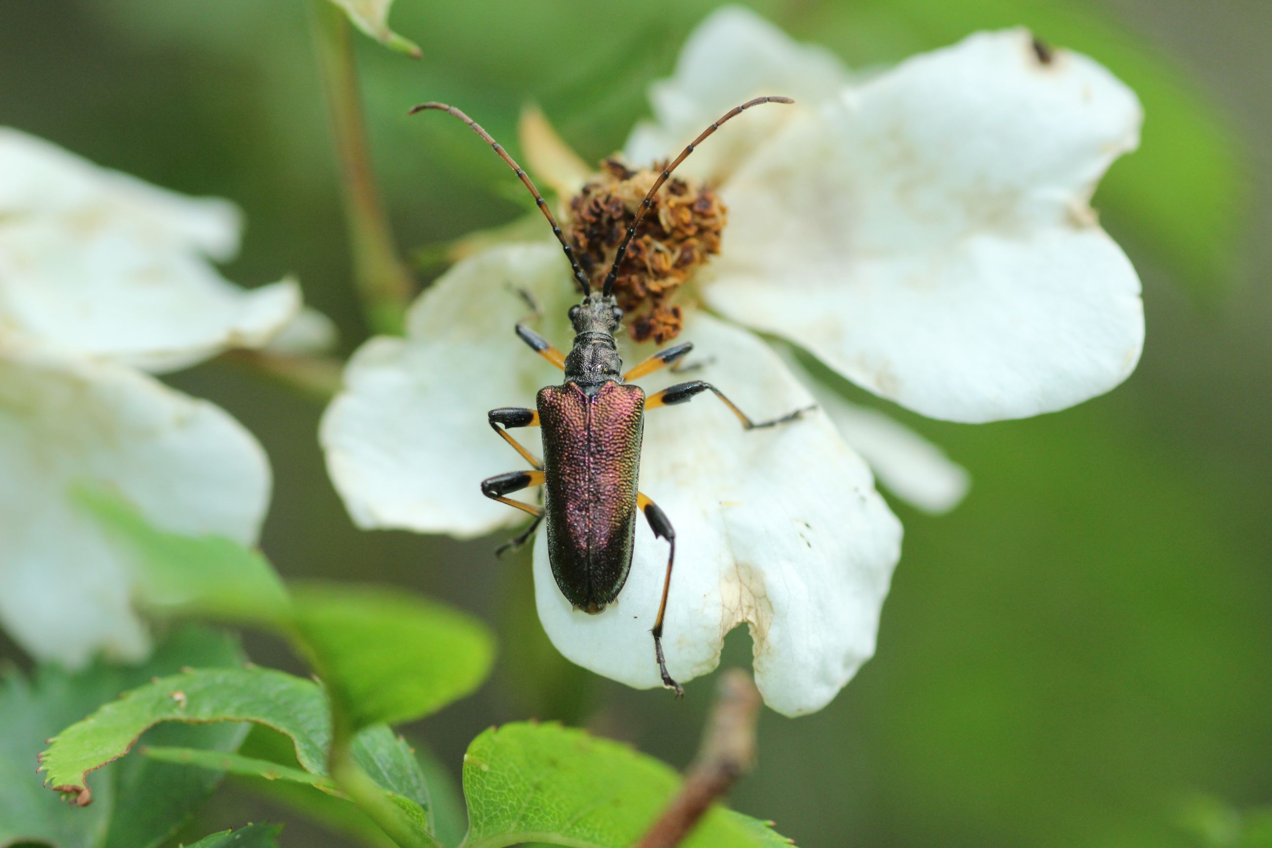 ノイバラの花に色々なカミキリムシがやって来ていました。日が陰ってきて動きが止まったところを撮影することができました。体長は12.9mm。