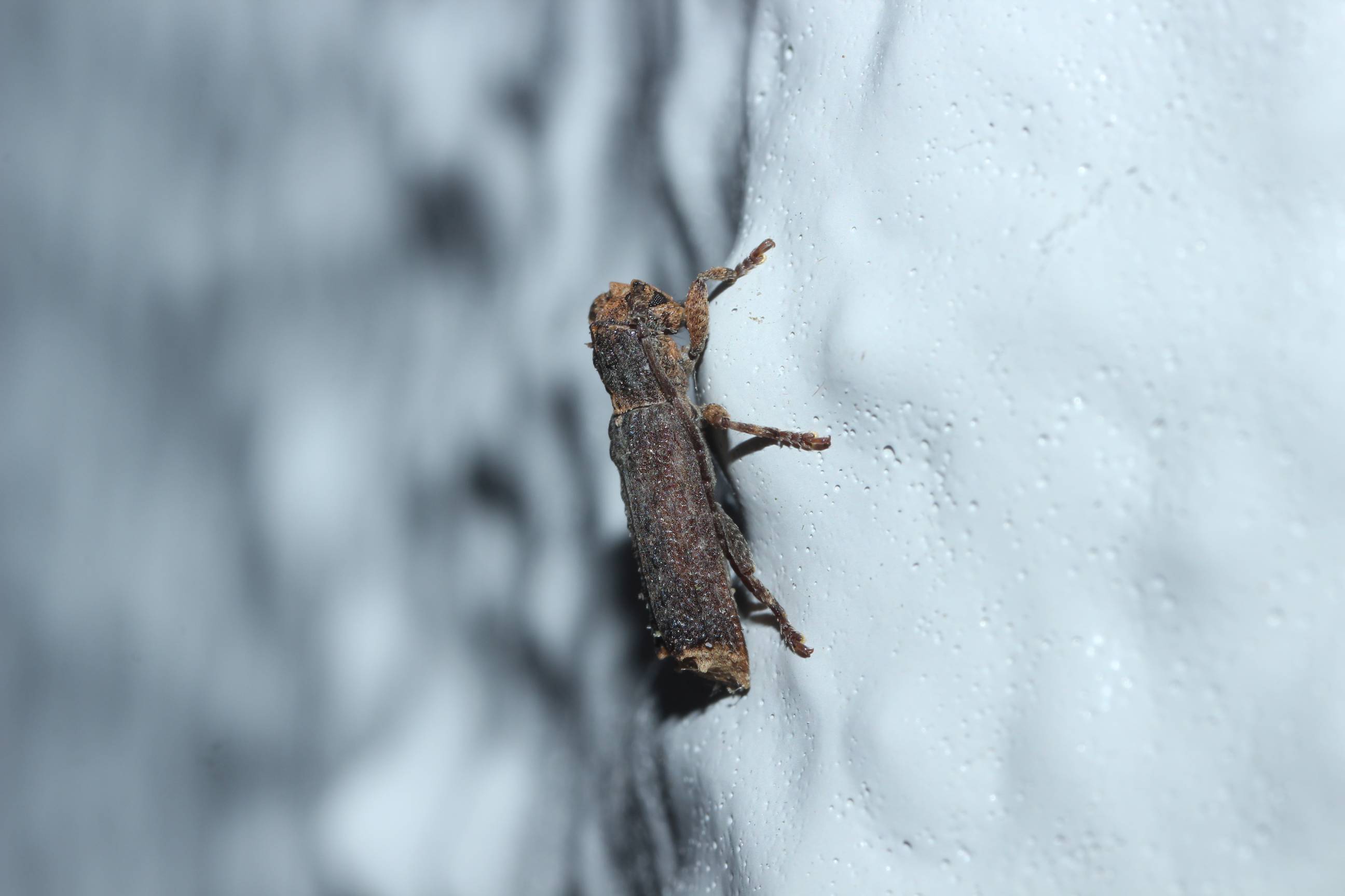 自宅団地の壁に止まっていたいましたが、はじめはカミキリムシだとわかりませんでした。初見の種類です。体長は約6.5mm。枯れたクズの蔓で見られるそうです。