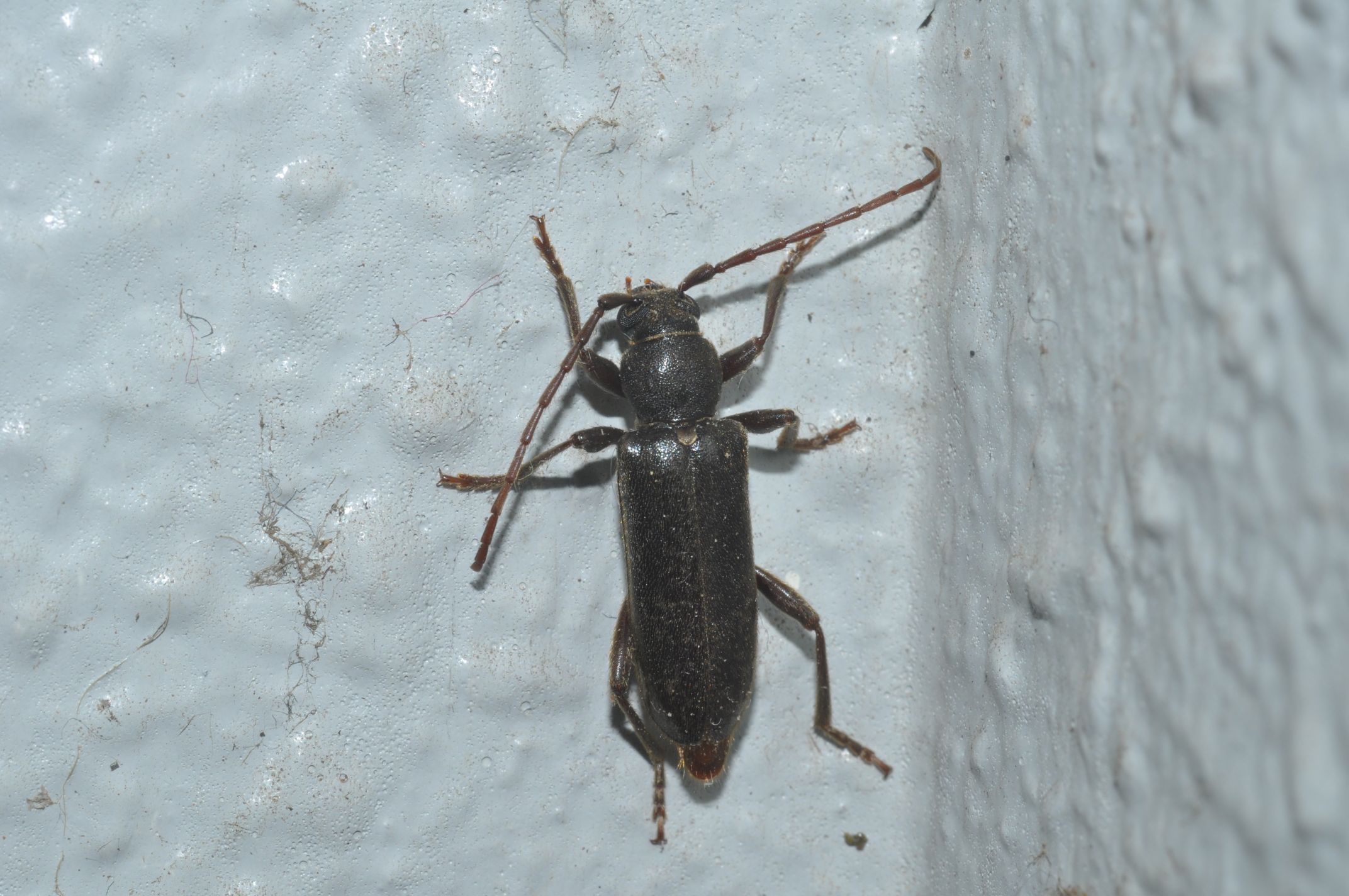 ムナクボカミキリの仲間に似ていますが、鞘翅に隆条がなく、脚もムナクボカミキリよりも太めです。写真の個体の体長は約17.3mm。