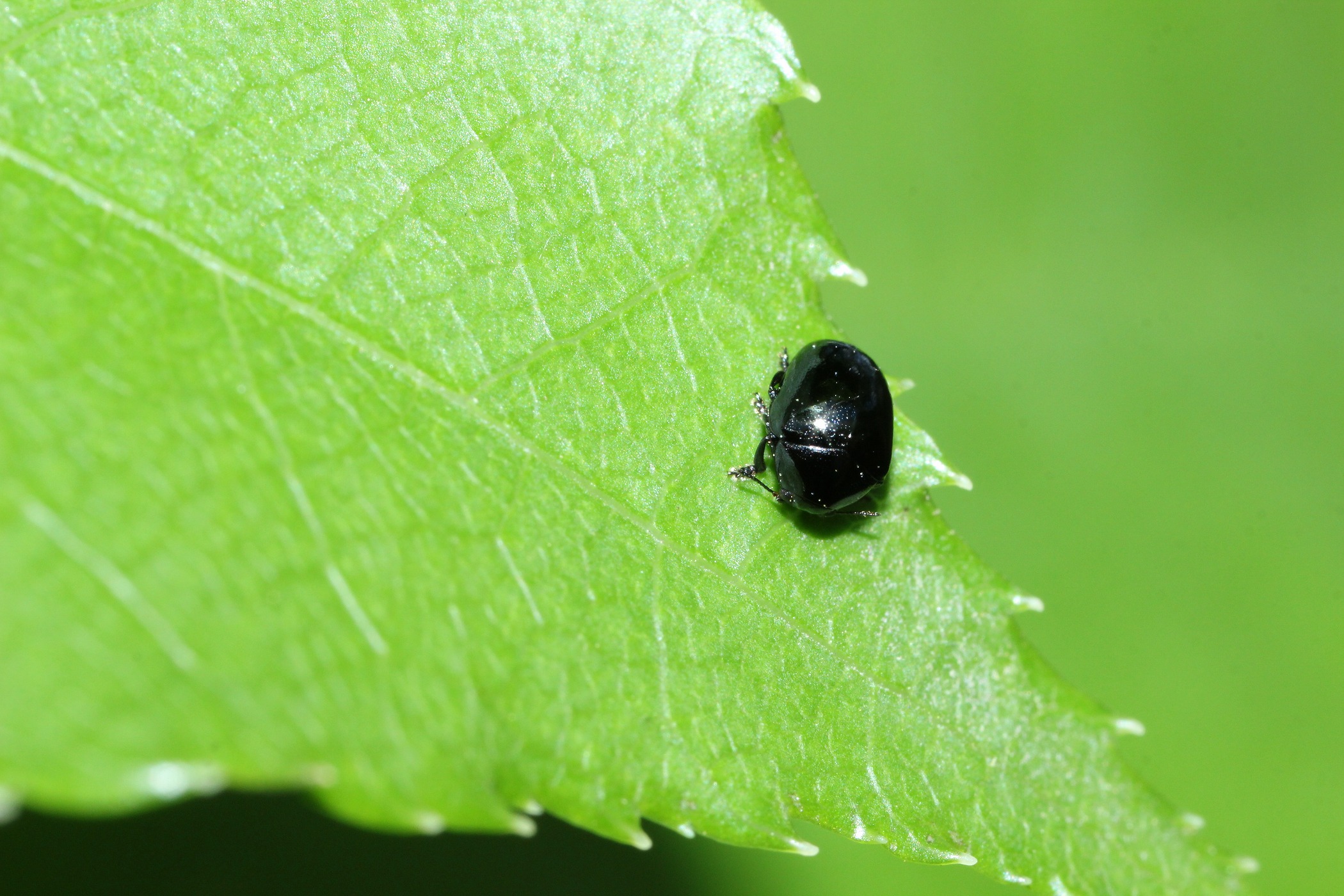 タラノキでよく見られるドウガネツヤハムシを黒くして一回り大きくしたようなハムシです。写真の個体の体長は約2.9mm。ハリギリに多数ついていました。