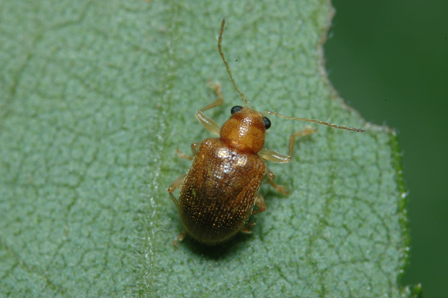 体長が約3.2mmの小型のサルハムシ。クワを食草にするそうです。同じくらいの大きさでクワにつくカサハラハムシやチビカサハラハムシとは胸の背面にカールした比較的目立つ毛が生えていることで識別できます。