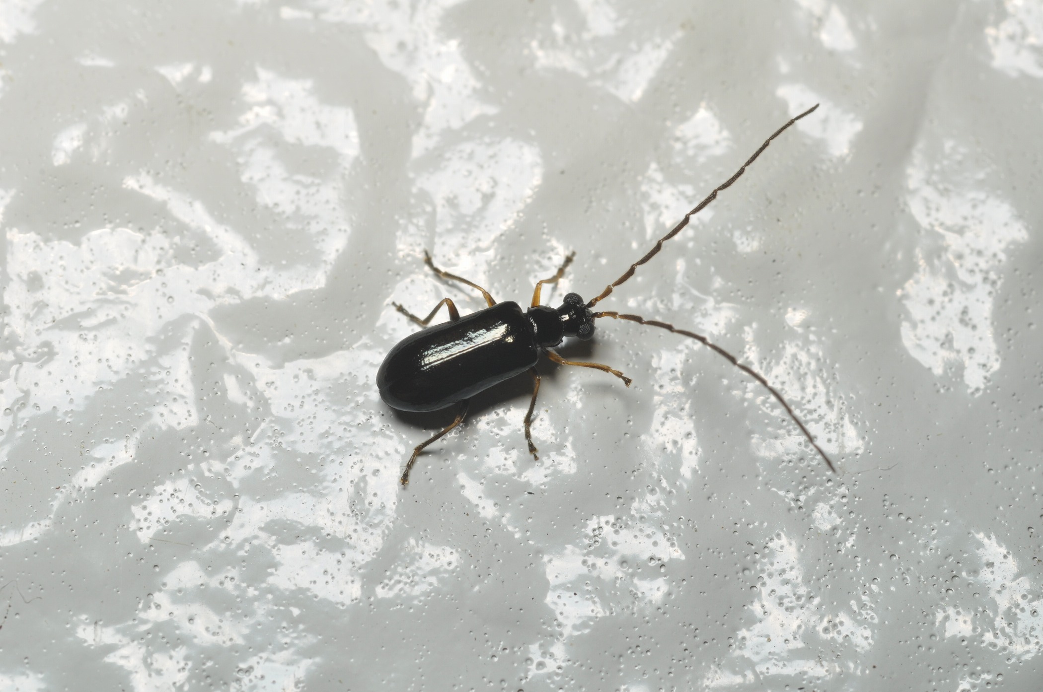 黒くて艶のあるハムシです。食草はトウゴクミツバツツジ、ヒトツバカエデなど。写真の個体の体長は約5.0mm、触角の長さは体長よりも長く、触角は約6.9mm。