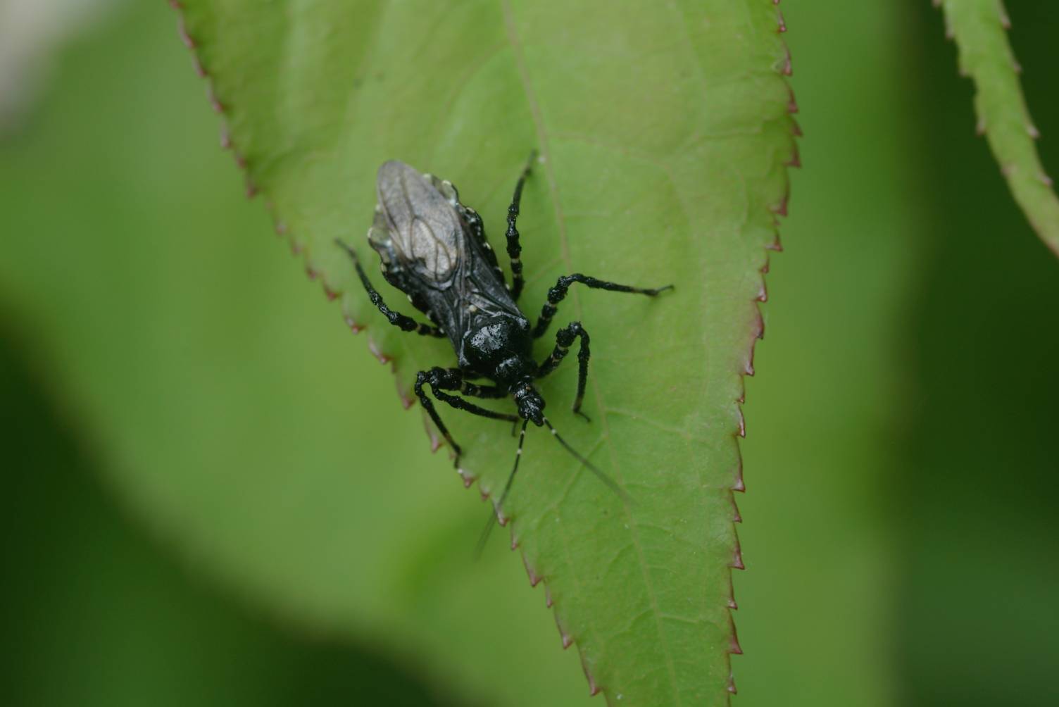 全身が黒いサシガメで、腹部の側面の結合板が翅から大きくはみ出している。5月から6月頃に新成虫が姿を現す。