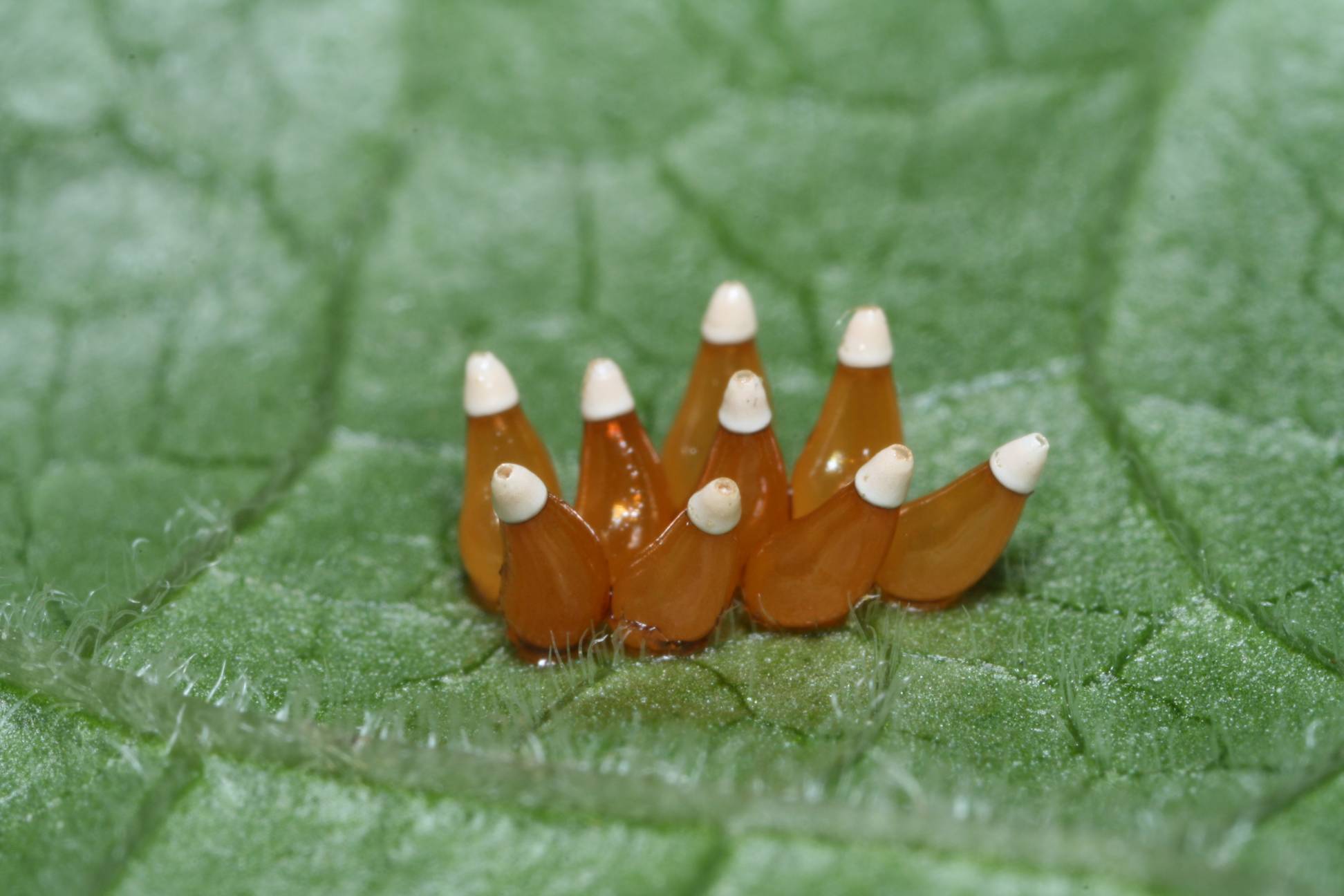 クサギの葉をめくってみると、どこかで見たような記憶がある赤っぽい色をした昆虫の卵らしきものが付いていたので、とりあえず撮影しておきました。カメムシ図鑑をパラパラとめくっていくと、アカサシガメの卵だということが判明しました。