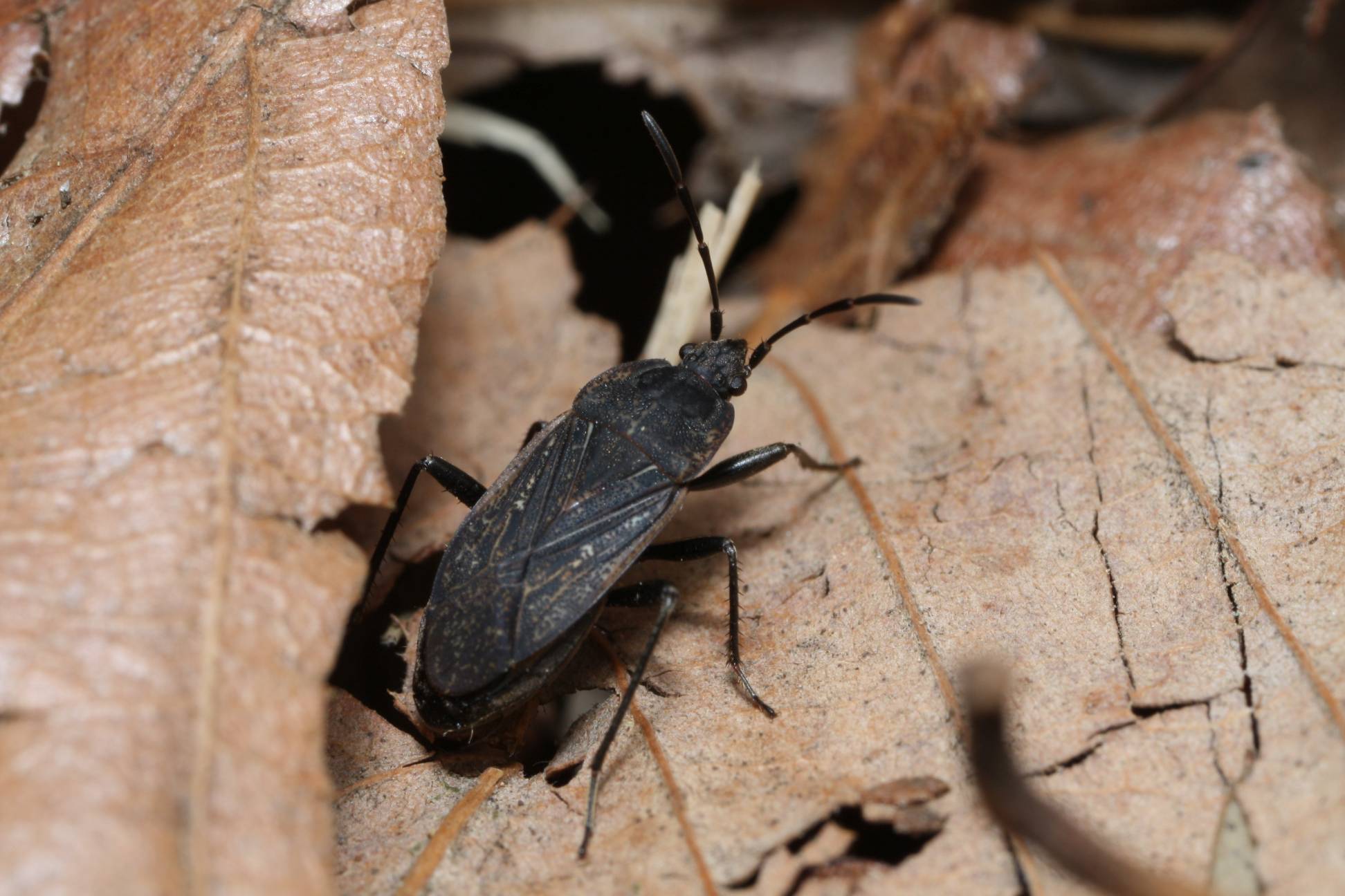 一見全身が黒一色に見えて、「シロヘリ」というネーミングはあまりふさわしくないように思いますが、よく見ると、前翅の前縁が付け根の方の半分ほどやや色が薄くなっています。枯葉の間をごそごそと歩いていました。体長は約8.1mm。