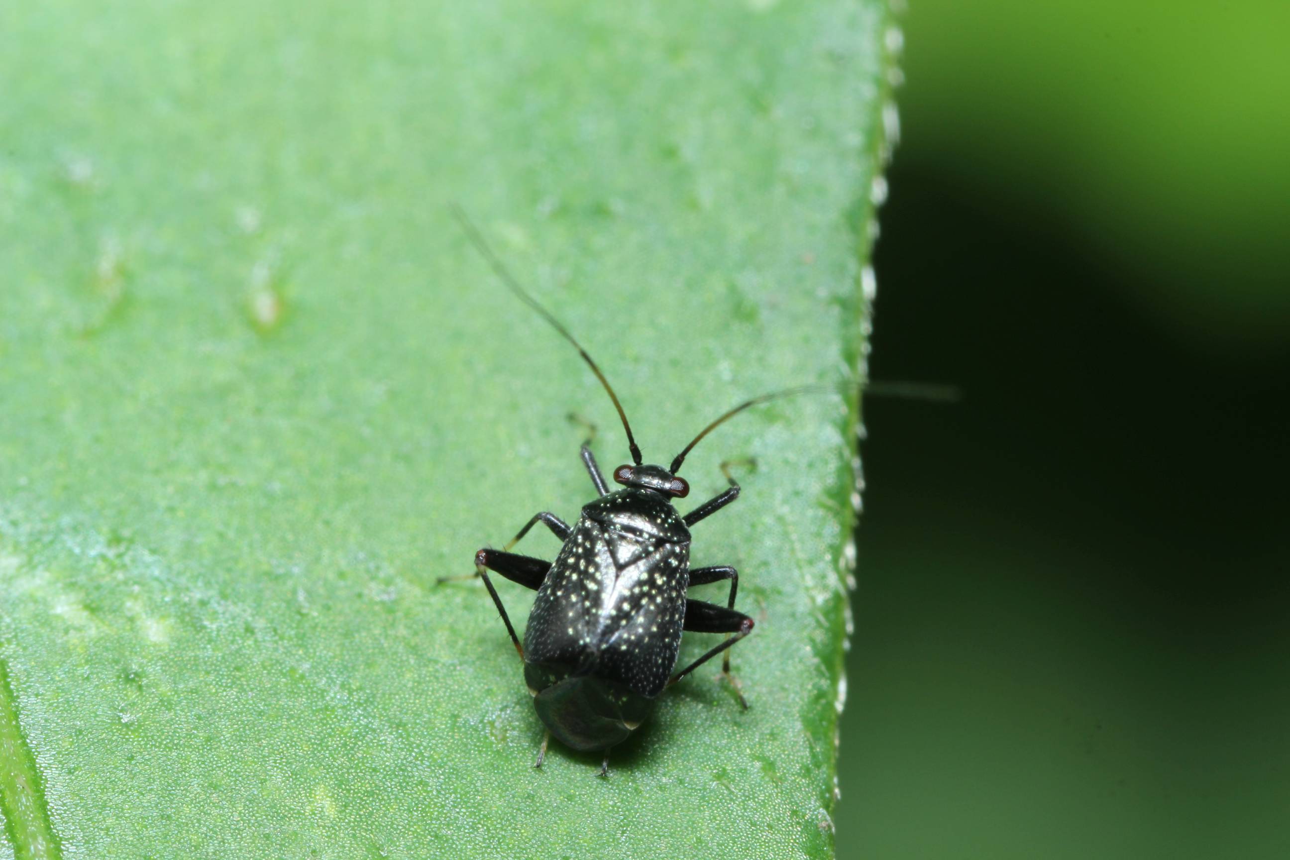 肉眼で見ると真っ黒な光沢のある小さなカスミカメムシですが、こうして拡大してみると白い小さな点があるのが分かります。体長は約2.6mm。