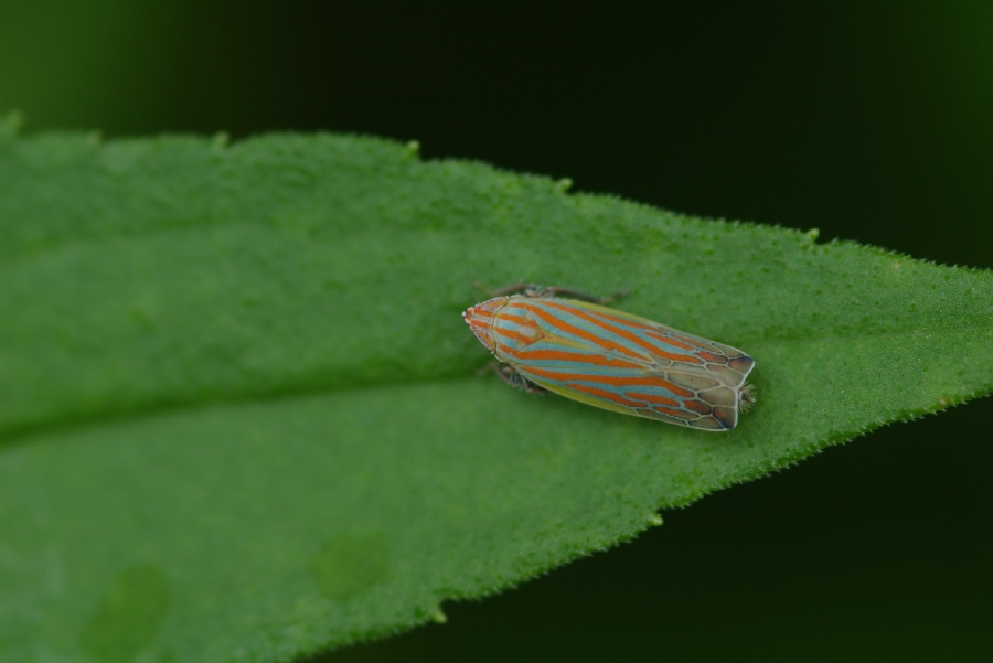 | 長池公園で見られるヨコバイの中で一番美しい種類といってよいでしょう。頭の先から翅の先端までの長さは約7.2mmで、ヨコバイの仲間としては大きめな部類に入ります。マクロレンズで拡大して見ると紅色の筋がはっきりと観察できてとてもきれいですが、1mくらい離れて肉眼で見たときには紅色の筋と薄緑色の地の色が混ざって白っぽい茶色のゴミのようにしか見えません。10月の初旬から11月初旬頃までススキの生えている草原で見ることができました。 |