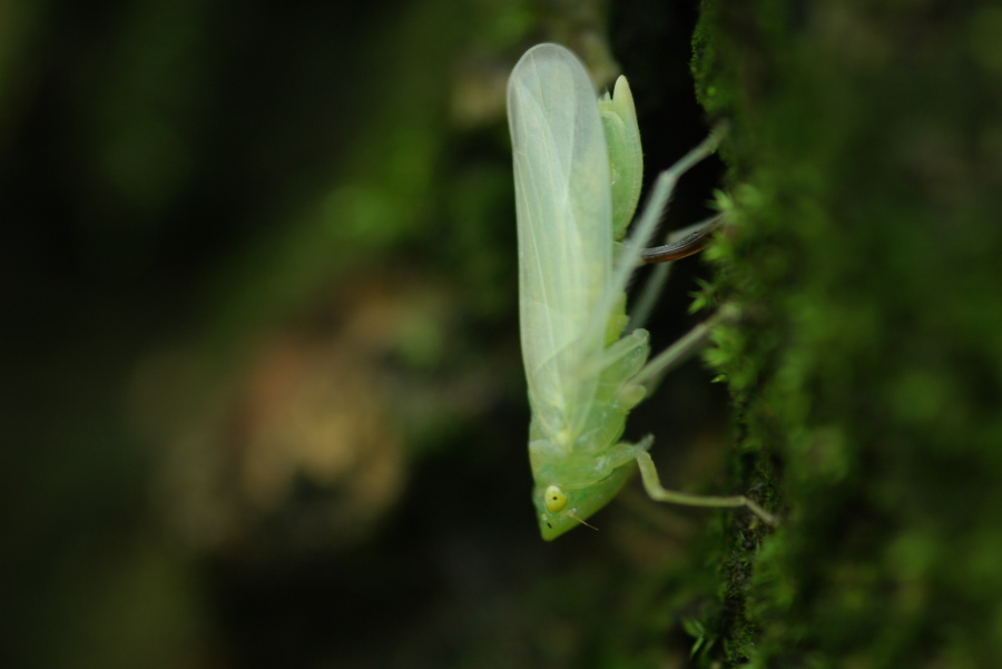 全身がやや緑色を帯びたクリーム色をしていて、鼻先に黒い小さな点があるのが特徴です。体長は約11.7mmある大型のクワキヨコバイ。苔のはえているクヌギの幹に産卵していました。