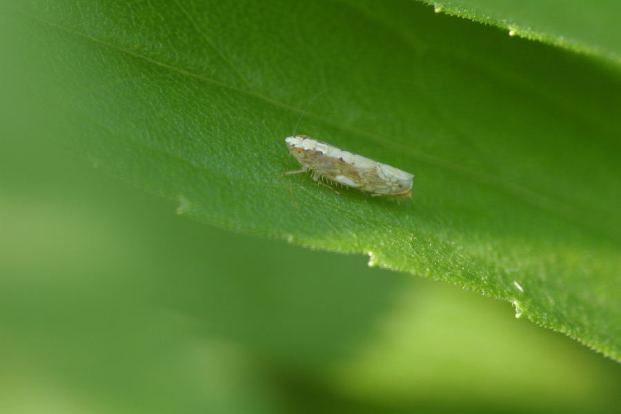 背面の白い帯がよく目立ちます。頭の先から翅の先端までの長さは約5.2mm。マクロレンズで拡大して見ると複眼の上部がほんのりとオレンジ色に染まっているのがわかります。日当たりの良い、ススキやセイタカアワダチソウ、ヨモギが入り混じった斜面で1匹だけ見つけました。