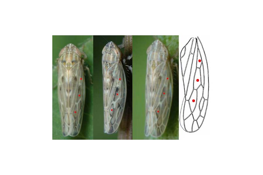 | トバヨコバイの翅が褐色の個体と外観が似ていますが、マダラヨコバイは、赤い点で示すように、前翅の中央部のセルが3室に分かれており、それに対してトバヨコバイでは2室になっている点で識別できそうです。前翅のイラストは以下の文献からコピーしました。 Kamitani S., The Phylogeny of the Genera in the Tribes Deltocephalini, Paralimnini, and Their Allies ESAKIA, (39) : 65- 108. March 31,1999 |