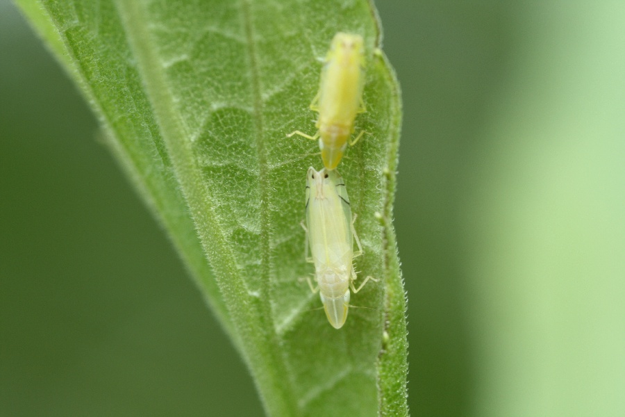 おそらくオスとメスのペアでしょう。上の黄色味が強いほうがオス、白っぽいほうがメスだと思われます。オスは翅端までの体長が約4.6mm、メスのほうは約5.2mmでメスの方がやや大きめです。セイタカアワダチソウの葉の裏側に止まっていました。