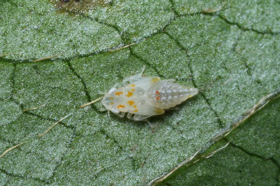 ヤマツツジの葉の裏側に張り付いていました。半透明の白い体にオレンジ色の斑紋が入っていてなかなかきれいです。成虫も1匹同じ木にいたので、おそらくNaratettix rubrovittatusの幼虫で間違いないと思います。体長は約2.6mm。