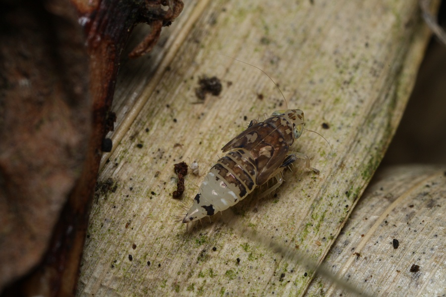 ヒトツメヨコバイの成虫の写真を撮影していると、近くにヨコバイの幼虫がいました。家に帰ってからwebで調べてみると、ヒトツメヨコバイの幼虫のようです。名前の由来となっている頭部の黒い「一つ目」はなく、褐色の複数の斑点があります。写真の個体の体長は約4.1mm。