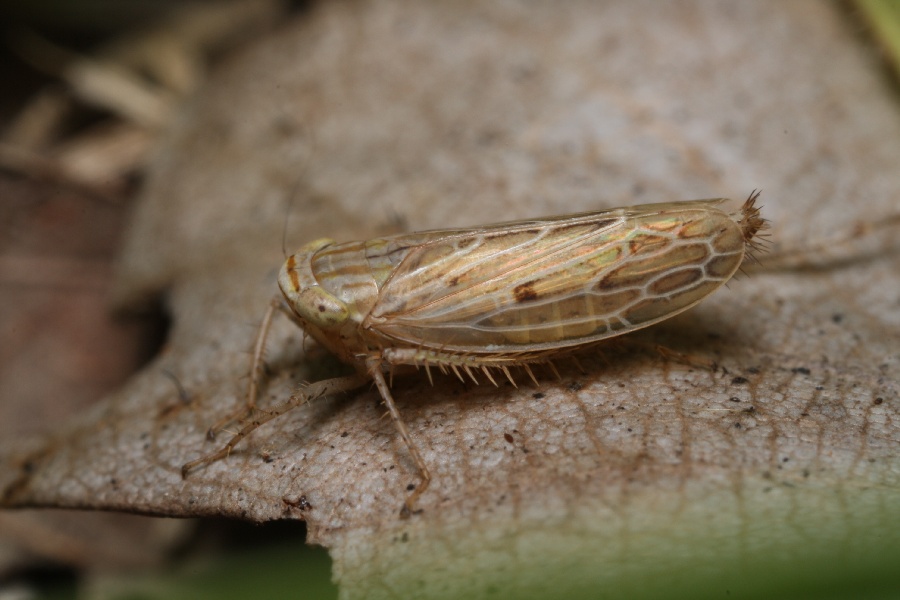 | 最初はシロミャクイチモンジヨコバイだと思っていたのですが、左右の複眼の間にある横線が茶色くシロミャクイチモンジヨコバイとは微妙に異なっています。対馬産頸吻亜目(昆虫綱,半翅目)(1)セミ型下目/山田仁子;林正美;大原直通他 長崎県生物学会誌(65)[2009] に掲載されているウスアカイチモンジヨコバイの標本写真と外観が似ているので、ウスアカイチモンジヨコバイとしましたが、違っているかもしれません。 |