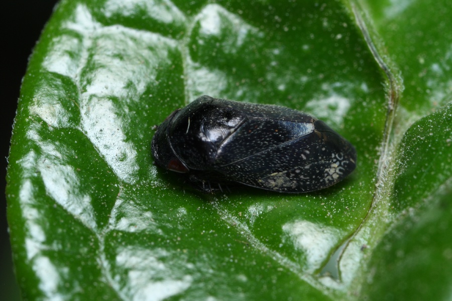 | クロヒラタヨコバイだと思っていましたが、写真の整理をしているときに他のクロヒラタヨコバイと比較してやや大きめなことに気付きました。写真を詳細に見ると、クロヒラタヨコバイでは前翅の毛の生え方に粗密があるのに対して、この写真では全体に均一に生えているので、クロヒラタヨコバイとは別種のオオクロヒラタヨコバイではないかと考えました。写真の個体の体長(翅端まで)は約5.1mm。 |