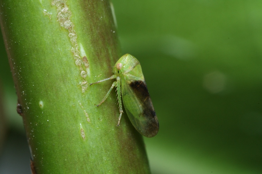 桑を寄主植物にしているハトムネヨコバイです。体色は黄緑色で前翅の合わせ目が黒褐色をしています。複眼の後ろ側に短い線状の小さな黒斑があります。翅端まで約4mm。