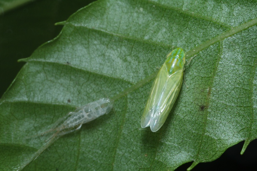 幼虫を見つけた栗で、羽化直後の成虫も撮影することができました。脇に幼虫の抜け殻が残っています。