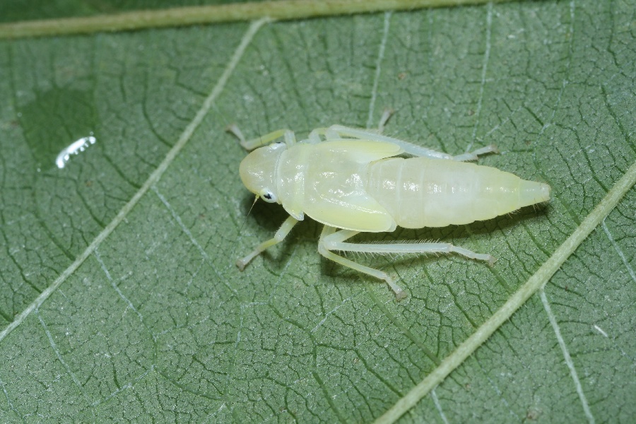 ツマグロオオヨコバイの幼虫は写真のように白っぽい色をしています。写真の個体の体長は約10.7mm。