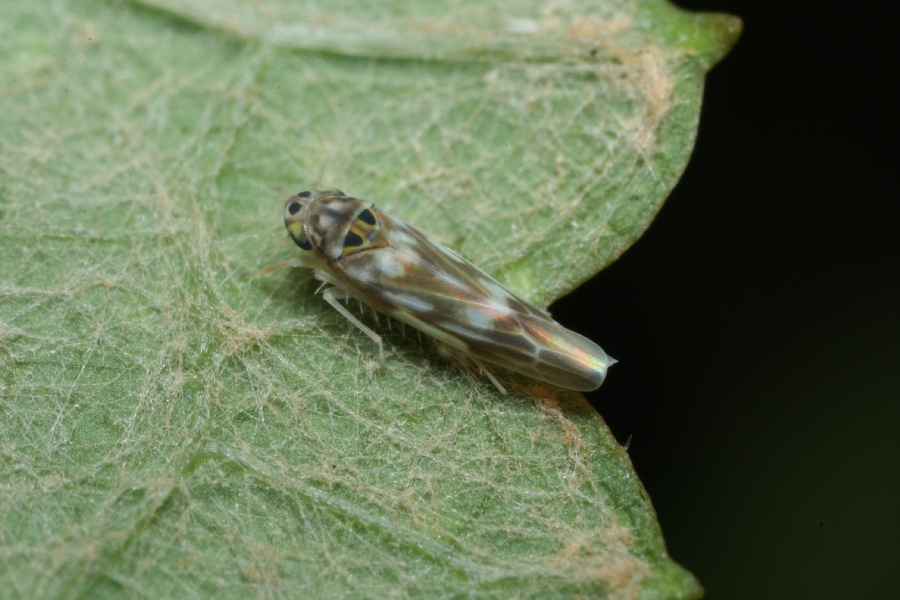 フタテンヒメヨコバイはブドウの害虫として知られています。長池公園では、ブドウ科のエビヅルの葉の裏側で見つけることができます。体長は約3.0mm。