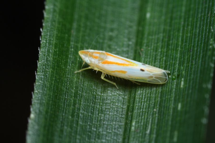| 離れて見たときにはあまり特徴のない白っぽい単色のヨコバイにしか見えませんが、近寄ってみると白地にオレンジ色のストライプが入って、翅には黒いスポットがあり特徴的な美しい模様をしていることがわかります。頭部は鋭角的に尖っています。写真の個体は、翅端までの体長が約3.2mmです。長池公園では、9月中旬から10月上旬頃にアズマネザサがまばらに生えた林縁で見られます。アズマネザサを寄主植物としているようですが、まだ幼虫を見たことがありません。 |