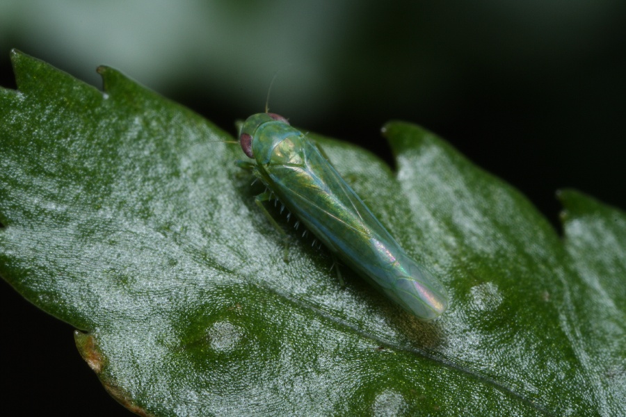 緑色のヒメヨコバイは、外見がそっくりな種類が何種類もいるようで、写真から種までを判断することはできないようですが、このEmpoasca vitisに限って言えば青みの強い体色と、翅の中央付近の翅脈に水色を帯びた部分が見られるので、典型的な特徴が現れていれば、画像からでも判断できそうです。