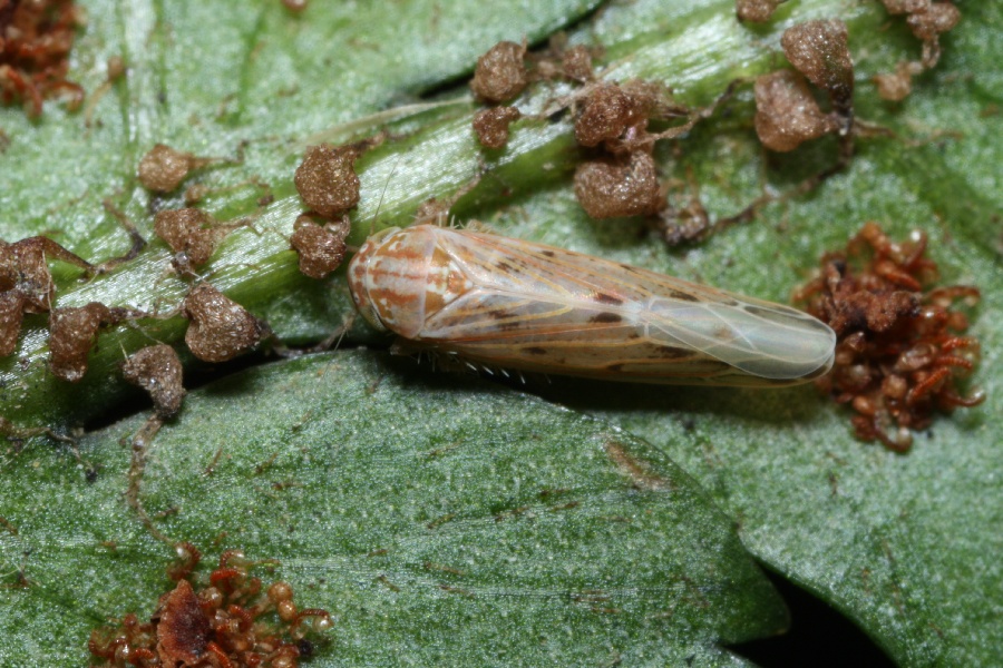 | 日本全土に普通に見られ、体や前翅が淡緑色のものと赤褐色のものがあります。写真の個体の体長(翅端まで)は約3.7mm。Rostria No.48,1999「日本産カスリヨコバイ属の分布」山田仁子 によると、近縁のカスリヨコバイは、北日本から多く採集され、関東・中部地方では主として標高700から1700mに生息しているようなので、長池公園付近で見られるのは、アカカスリヨコバイで良さそうです。 |