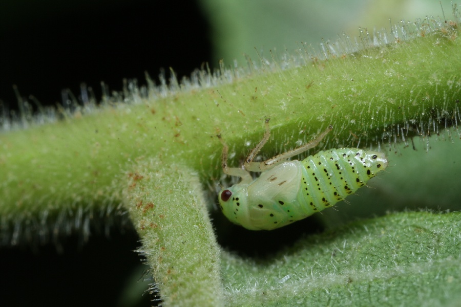 幼虫は体全体が薄緑色をしており、背面に小さな黒い斑点が整列しています。写真の個体の体長は約4.2mm。
