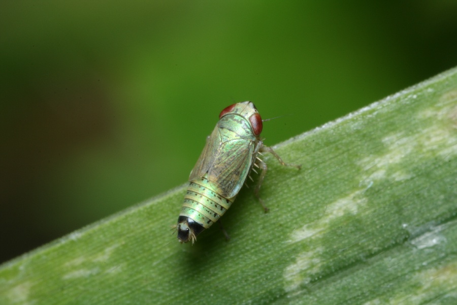 名前の通り、金属光沢をもった緑色の翅の短いヨコバイです。夏の暑い時期に芝地で見つけました。写真の個体はオスで、体長(腹端まで)は約2.5mm。オスは腹部の先端が黒くなっています。