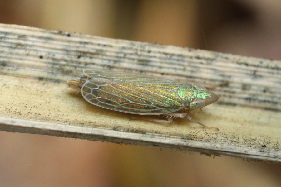 頭部は円錐状に尖っており、頭部から胸部にかけては、金属粉をまぶしたような薄緑色をしています。腹部の先端は前翅の後端部よりはみ出しており、写真の個体の体長(腹端まで)は約6.1mm、翅端までの長さでは約5.5mmです。