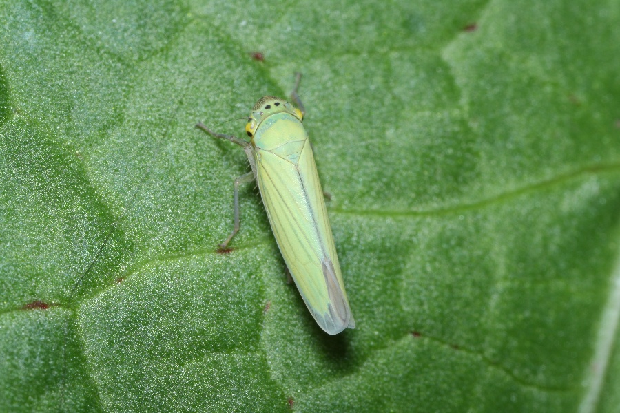 ヨコバイの仲間としては大型の部類に入り、写真の個体は、体長が約8.9mmです。全身がやや白味を帯びた黄緑色をしていて、翅の先端に色が付いていない部分があります。頭部の背面に1対の黒い丸い斑紋が見られます。背丈の高くない草原で普通に見ることができます。