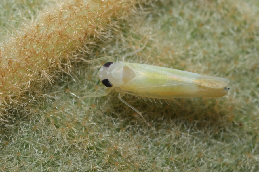 メスはオスと異なり、赤い部分が全くありません。この個体は複眼のほぼ全体が黒くなっていますが、ヒメヨコバイの複眼の色は個体や時期によって変化するようです。翅端までの体長はオスよりもやや大きく約3.8mm。