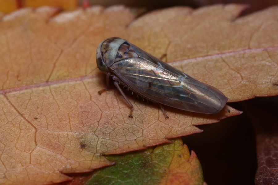 公園の園路沿いの鉄製の手摺の上で見つけました。動きがかなり鈍かったので、落ちていたカエデの葉に載せて撮影してみました。
