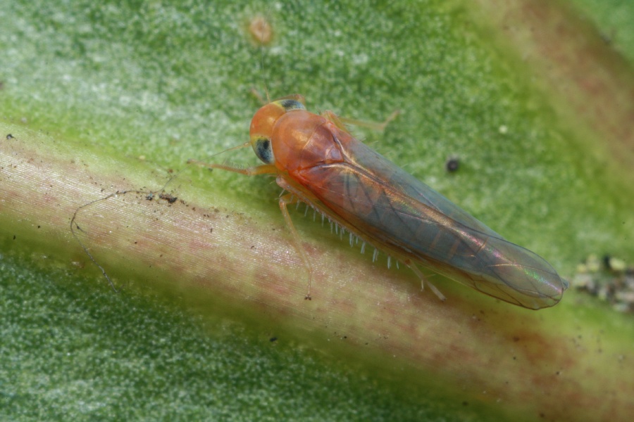 シキミの木で比較的数多く見ることができます。一見、カンキツヒメヨコバイのような色合いをしているので、見間違いそうですが、アカヒメヨコバイは、写真のように胸部には斑紋がないのに対して、カンキツヒメヨコバイでは暗灰色の横線があるので、少し注意して見れば比較的容易に区別することができます。