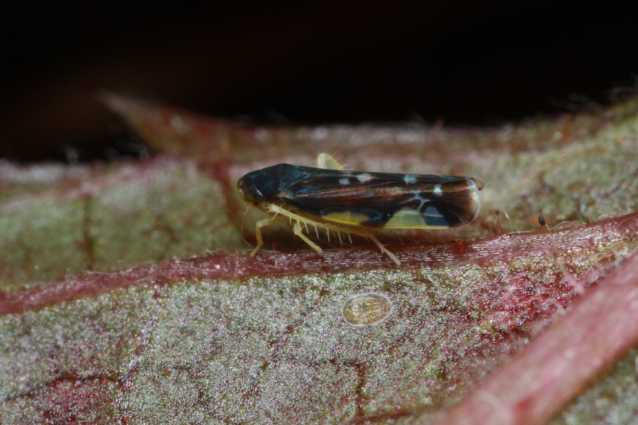 名前の通り、背面から見るとほぼ真っ黒に見えるヒメヨコバイです。比較的数の少ない種類のようで、国内のwebサイトでは画像を掲載しているところはまだないようです。長池公園では、11月から12月にかけて地表付近に葉を残しているクサイチゴに似た木苺類の裏側で稀に見られます。翅端まで約2.9mm。