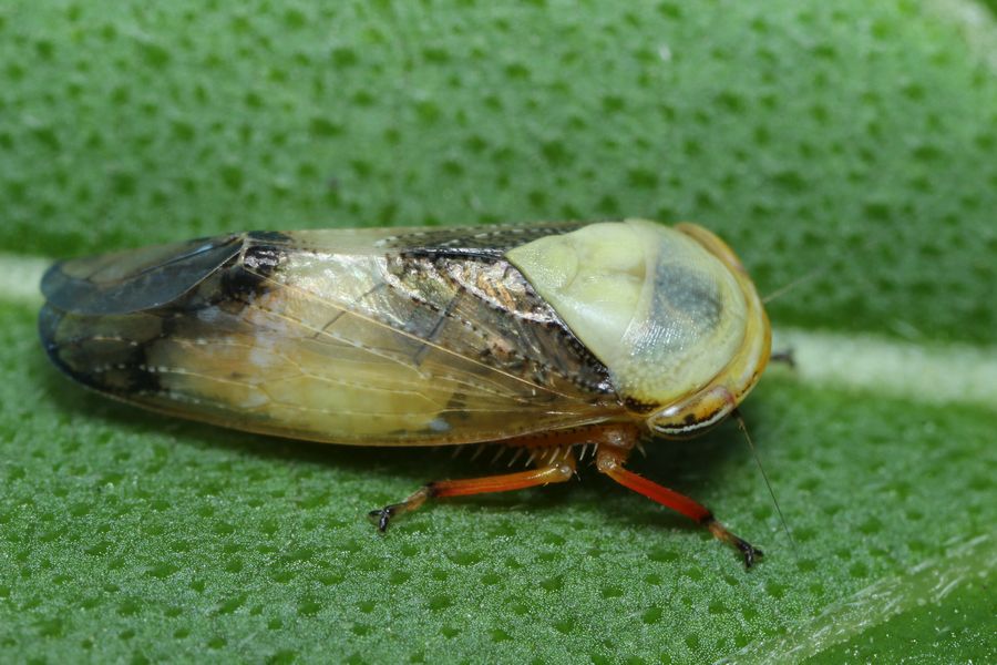 頭部と胸部が乳白色をしているので、羽化直後でまだ色が出ていないブチミャクヨコバイだと思って撮影していましたが、家に帰ってからwebで検索して見ると今まで撮影したことのなかったブスブチミャクヨコバイだということが判明しました。体長(翅端まで)は約8.3mmで、ヨコバイとしては大きめの部類です。
