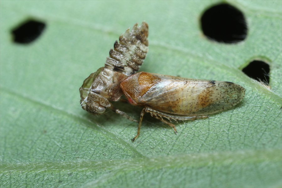 コナラの葉の裏側に羽化直後の個体が止まっていました。奥に写っているのが幼虫の抜け殻です。翅端まで約5.0mm。ゴマフハトムネヨコバイに似ていますが、フタオビハトムネヨコバイは頭部が緑色を帯びず大きさはやや大きめです。