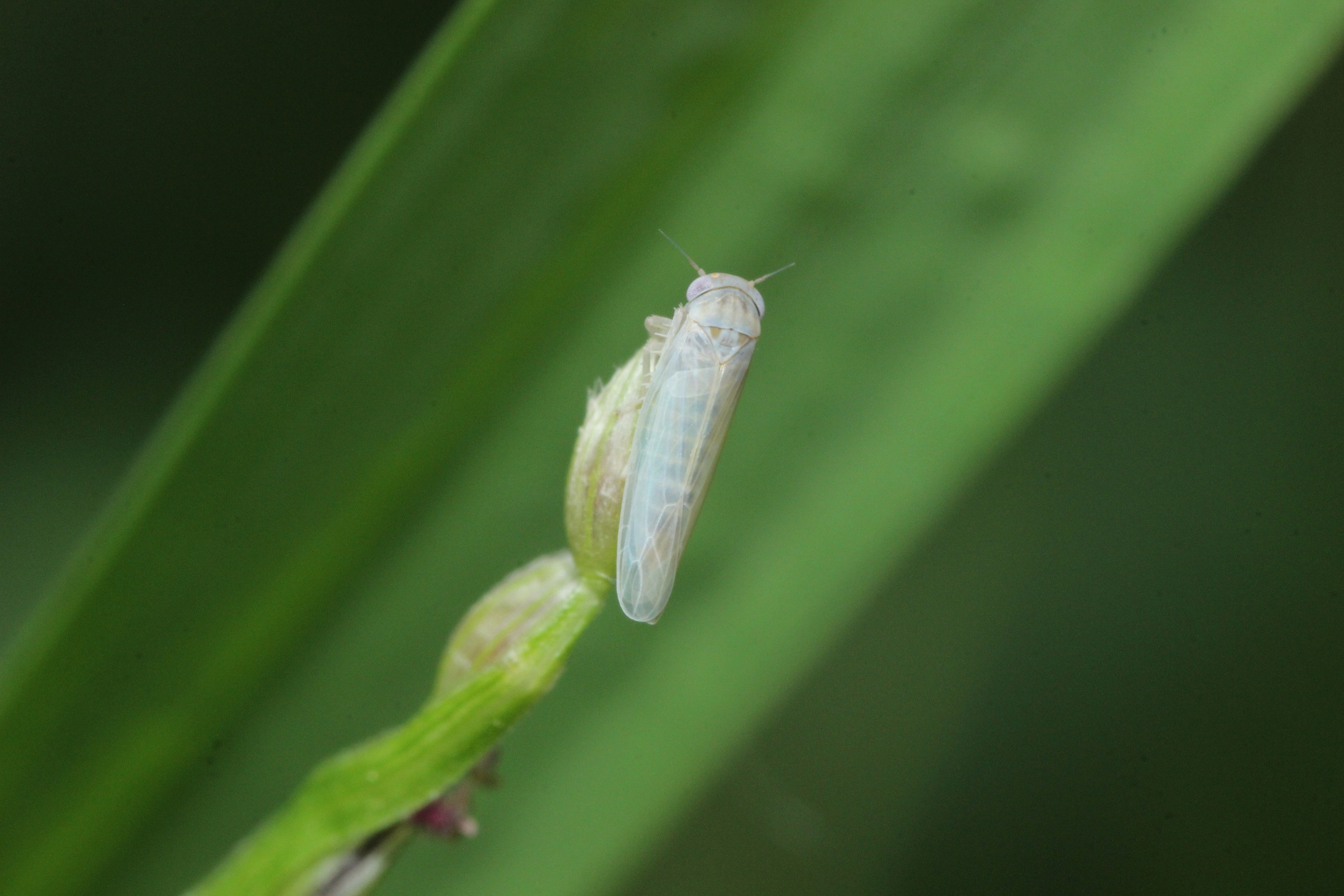 色彩は、全体的にあまり特徴のない灰褐色で、翅を透かして見えている腹部背面は褐色をしているようです。頭頂から翅端までの長さは約3.0mm。道端に生えているイネ科のカゼクサ