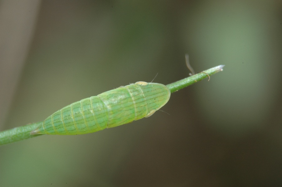 サジヨコバイの幼虫。成虫には斑紋が見られませんが、幼虫では頭部から腹部までを通る細い暗灰色の線が6本見られます。