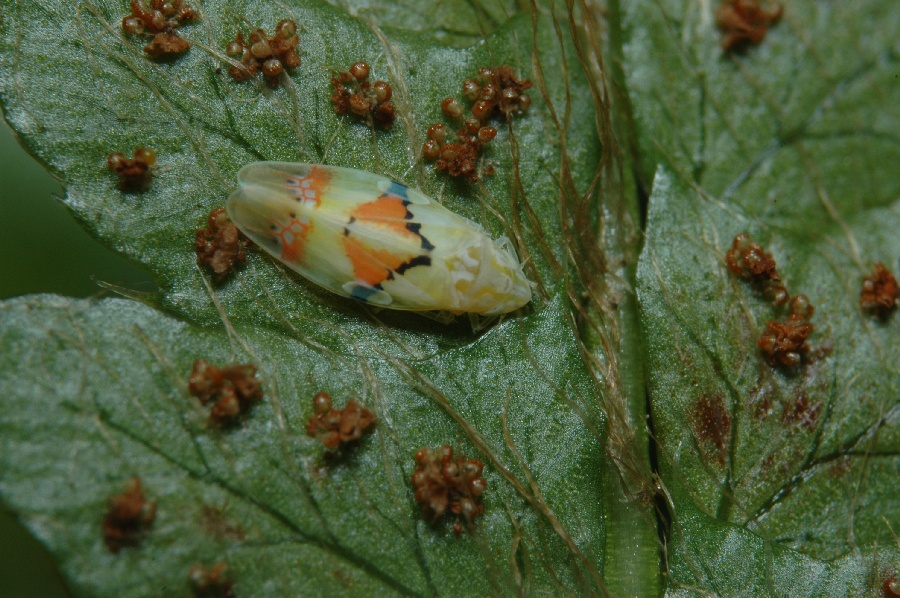 前の写真の個体と比べると、体の色が黄色みを帯びており、頭部から前胸背に伸びるストライプが赤みを帯びていませんが、菱型の朱色の斑紋の前縁に黒い縁どりがあるので、この写真の個体もベップオビヒメヨコバイだと思われます。体長は約3.6mm。