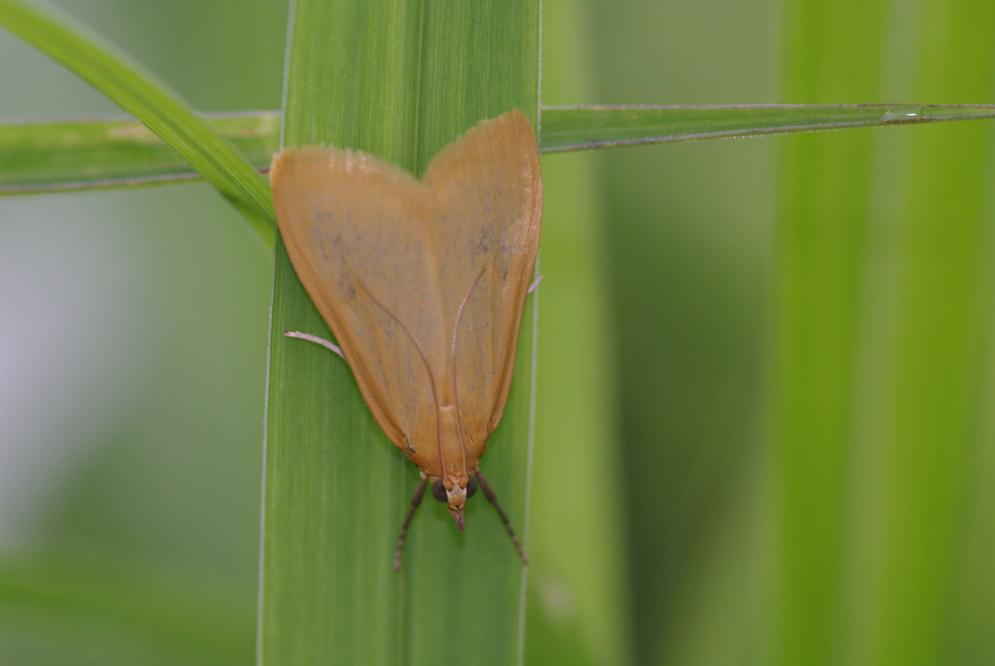 翅が黄色一色で、色彩的にはキベリハネボソノメイガのメスとよく似ていますが、注意深く見るとキムジノメイガのほうが前翅の翅頂の角度が大きい点で区別できます。