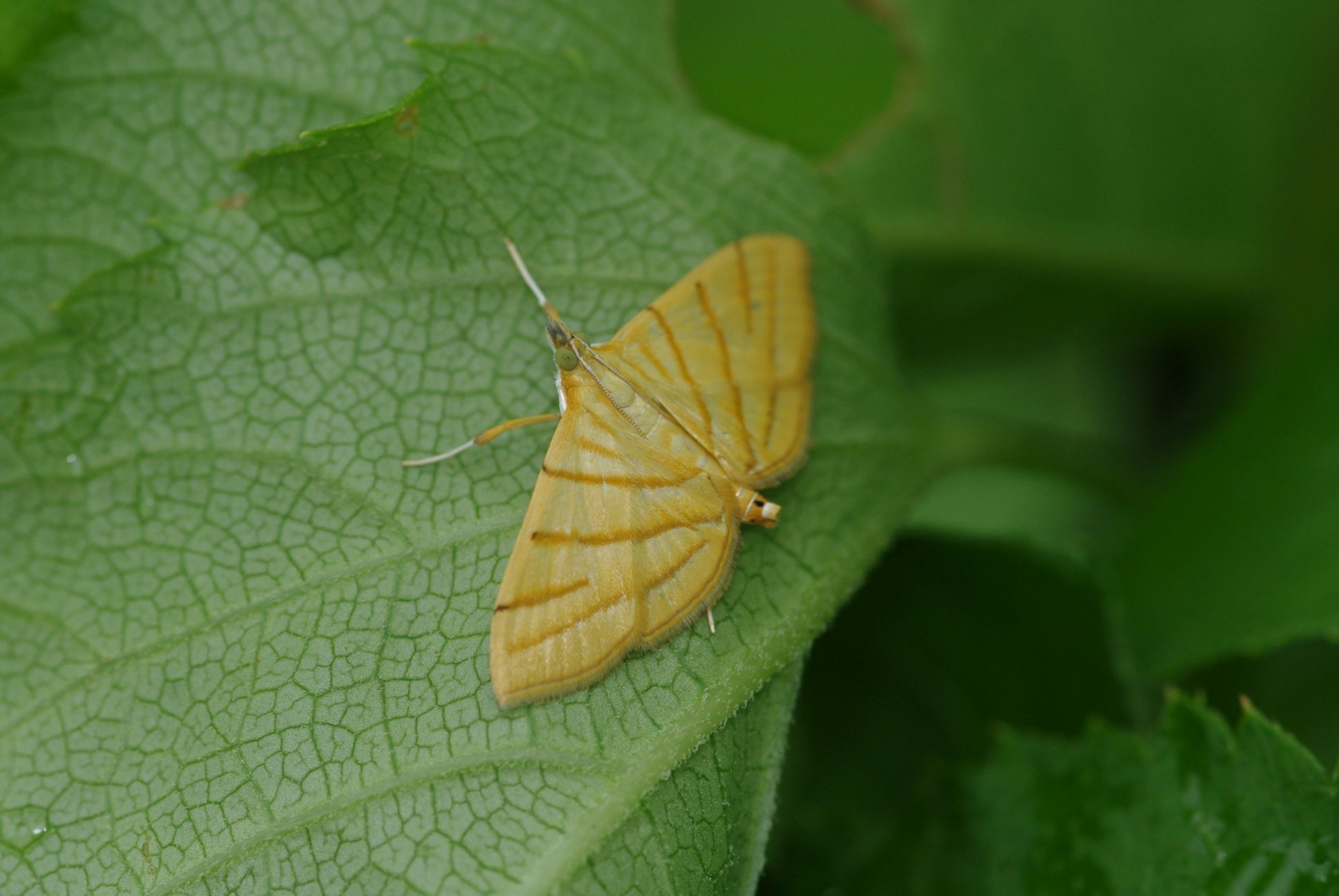 黄褐色の地色に褐色の細い筋が入っており、色彩的には次のマタスジノメイガに似ていますが、次種よりも褐色の筋は細めです。